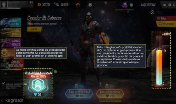 Cazador de Cabezas es el primer traje en formar parte del flamante Royale Legendario, una característica que no existía en Free Fire hasta éste lanzamiento. Habrá un medidor de suerte, para que con cada giro sea más fácil obtener el traje, y cada giro costará diamantes.
